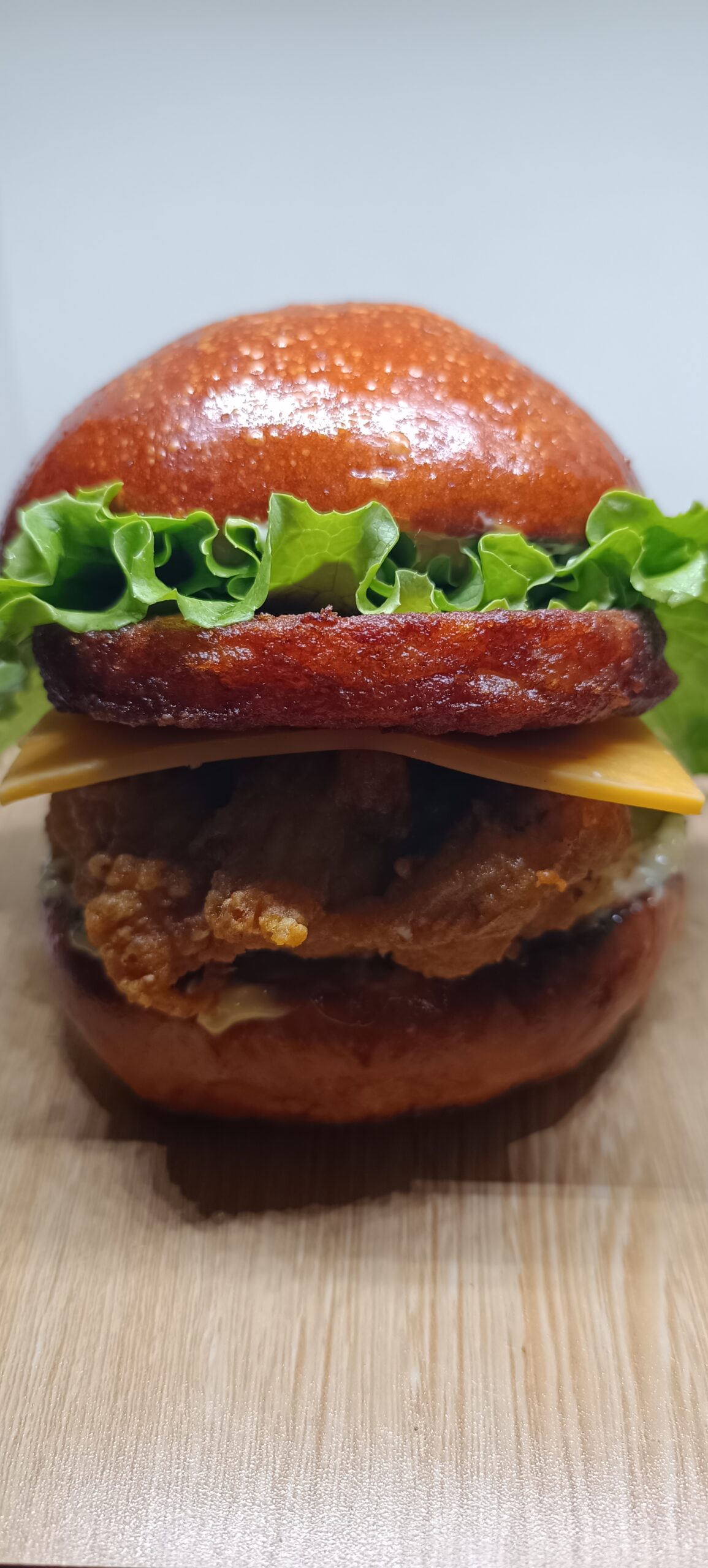 Pain rond boulanger, poulet pané, galette de pomme de terre, chaddar, salade, sauce