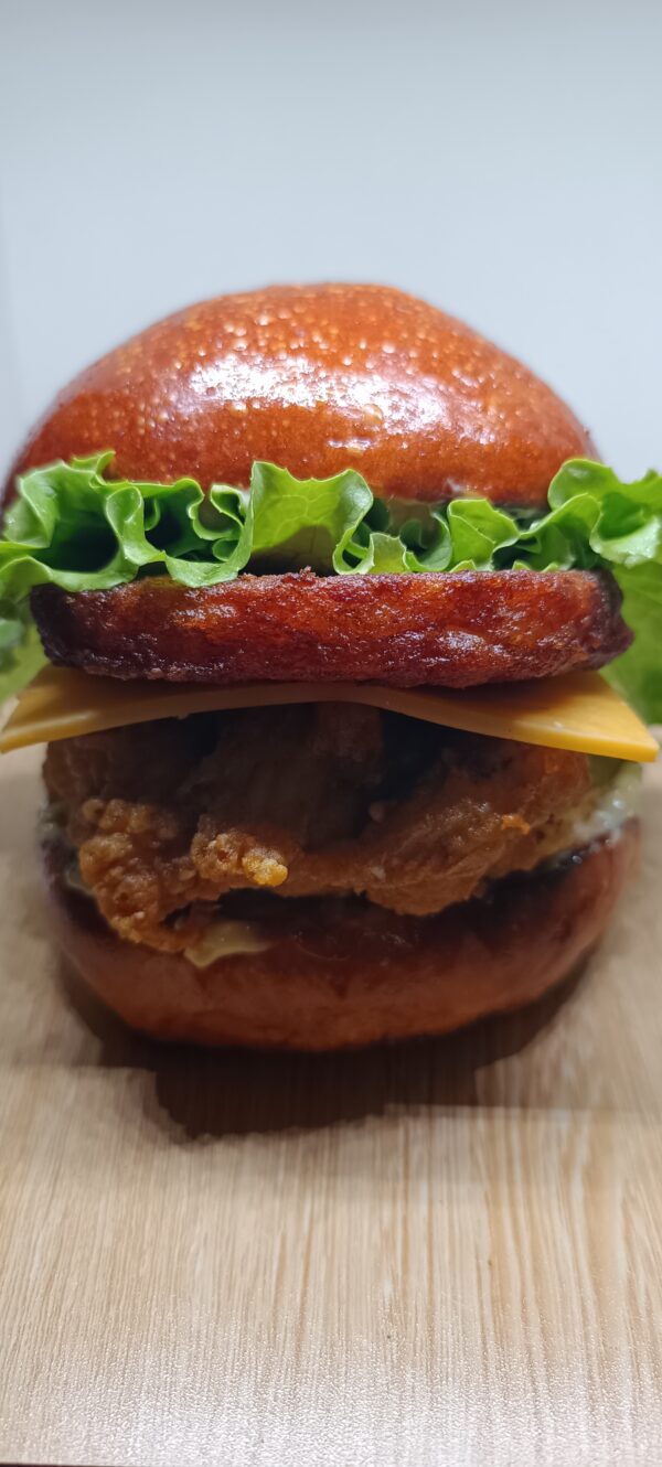Pain rond boulanger, poulet pané, galette de pomme de terre, chaddar, salade, sauce