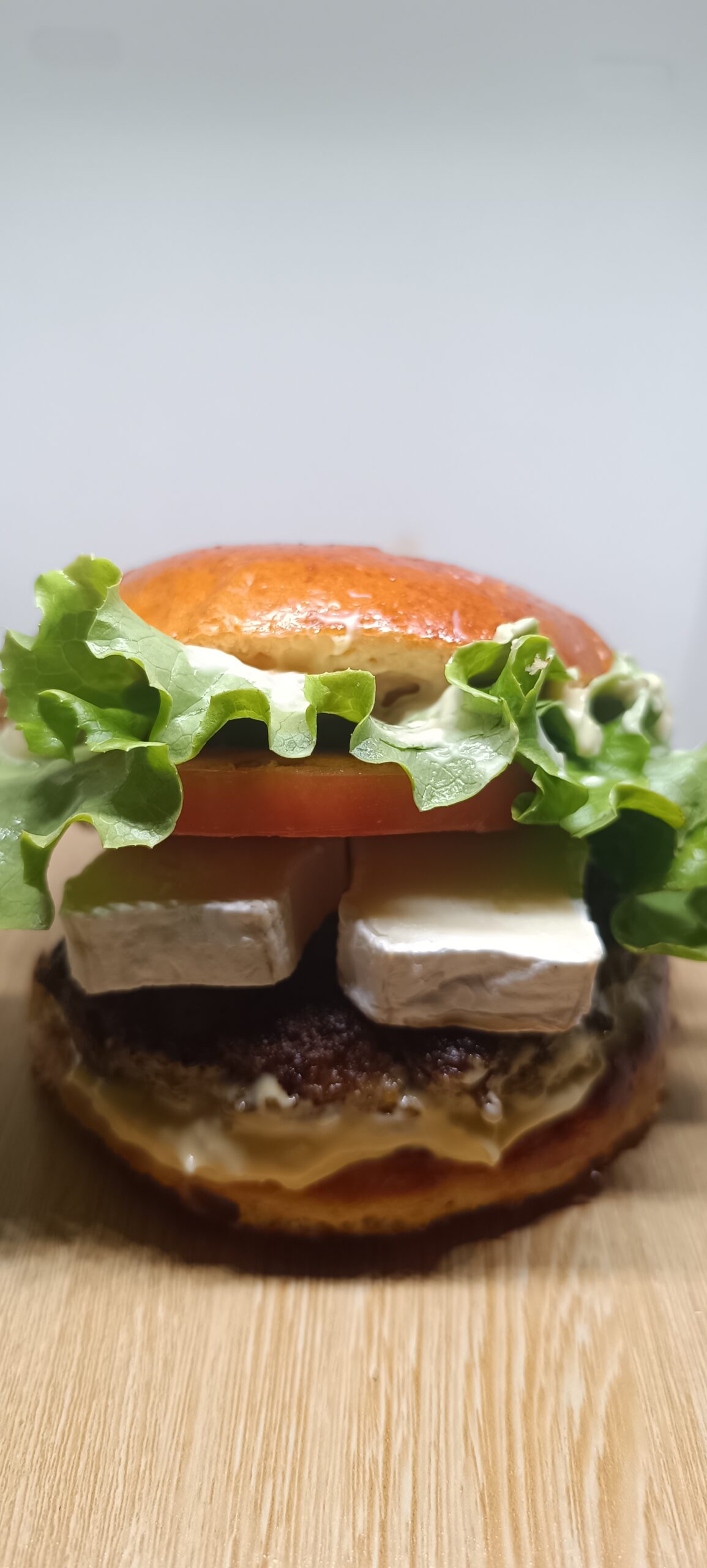 Pain rond boulanger, steak 120g frais, fromage de chèvre, salade, tomate, sauce
