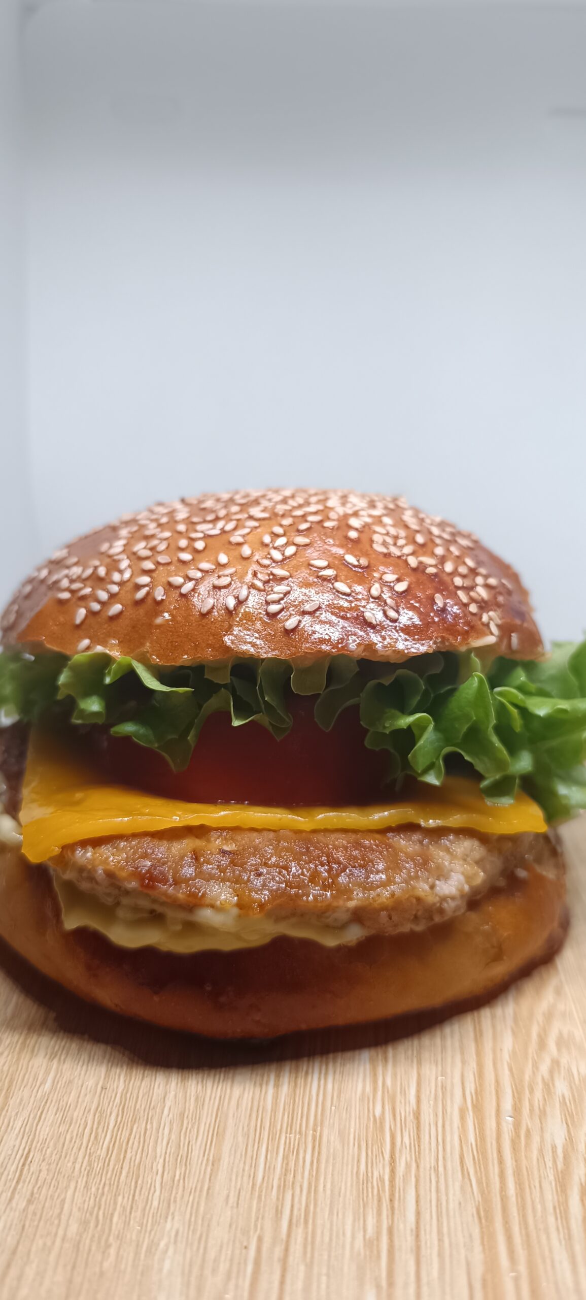 Pain rond boulanger sésame, steak de poulet frais, cheddar, salade, tomate, sauce
