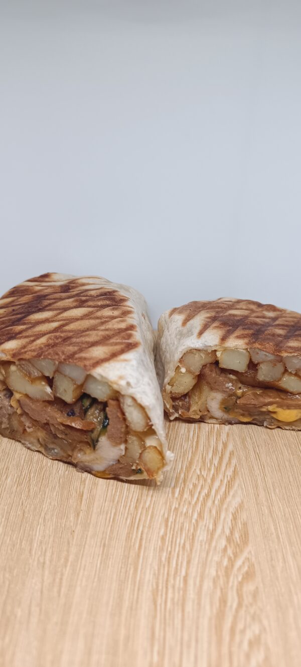 Double tortillas, 2 ou 3 viandes ( viande hachée, merguez, poulet, nugguets), sauce fromagère, emmental rapé, frites (frites et boisson comprises)