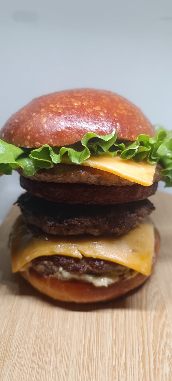 Pain rond boulanger, double steaks 120 g frais, steak de poulet frais, galette de pomme de terre, double cheddar, salade, sauce (frites et boisson comprises)