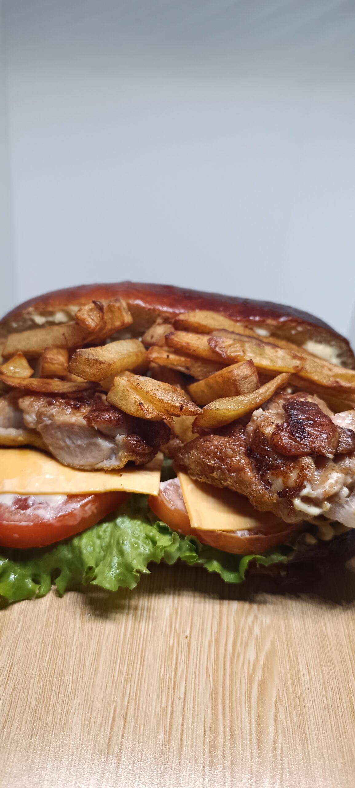 Pain long boulanger, poulet grillé, cheddar, salade, tomate, sauce